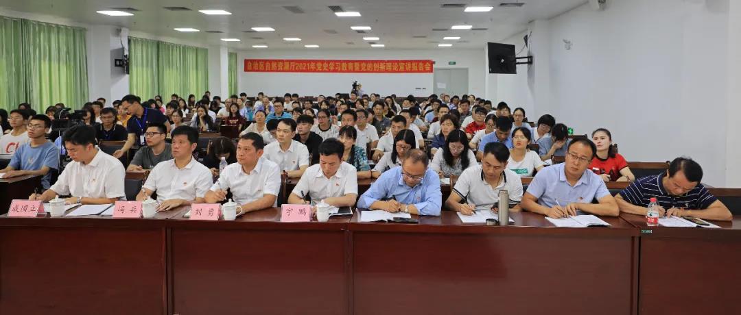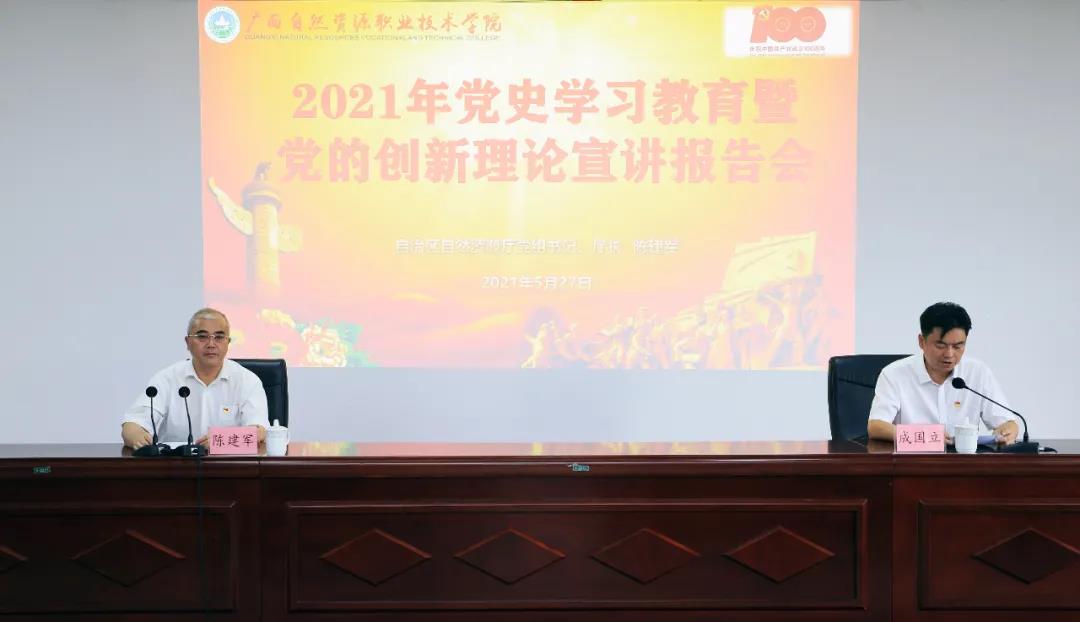 2021年5月27日下午,自治区自然资源厅2021年党史学习教育暨党的创新理论宣讲报告会,在pp电子官方网站召开。自治区自然资源厅党组书记、厅长陈建军来到学院,并围绕深入学习贯彻习近平总书记视察广西时的重要讲话和指示精神,作了题为《学习百年党史 汲取智慧力量 奋力书写更多“技能改变人生”的精彩故事》的党史学习教育专题宣讲报告。报告会由学院党委书记成国立主持。