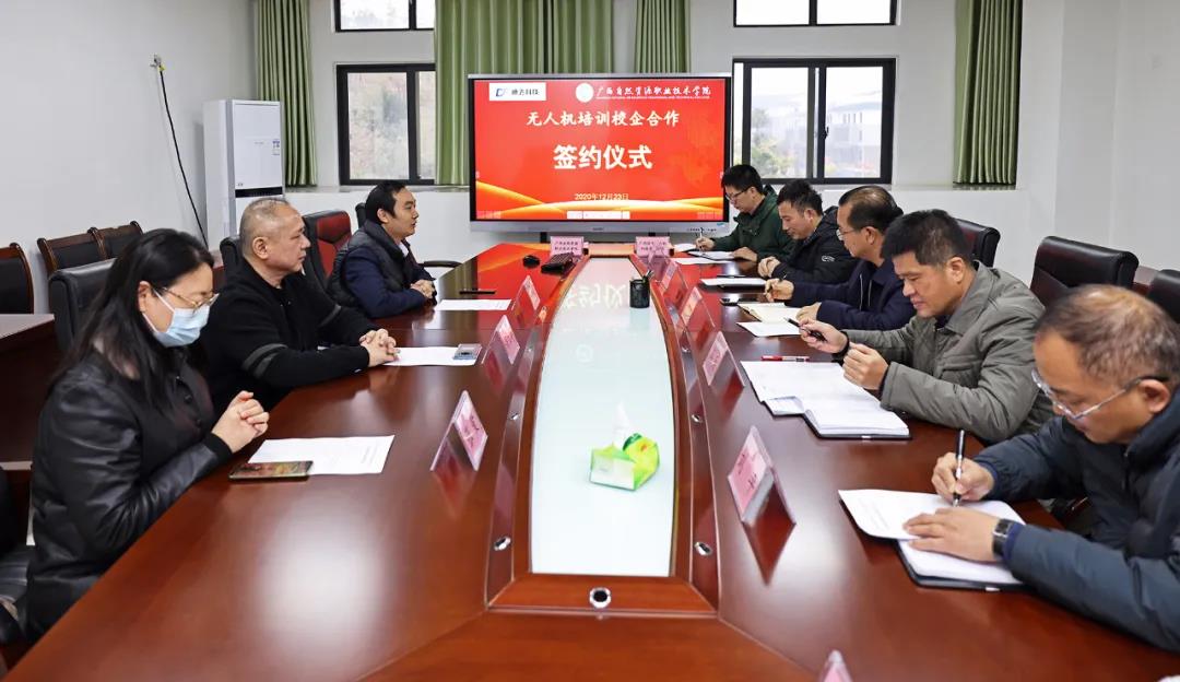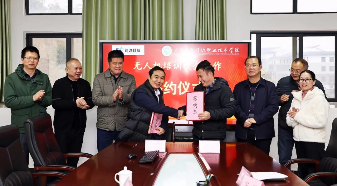 广州迪飞无人机科技有限公司总经理胡祖火一行,与学院党委书记陈朝新、院长冯兵、副院长宇鹏及学院相关处室负责人,出席了当天的签约仪式。