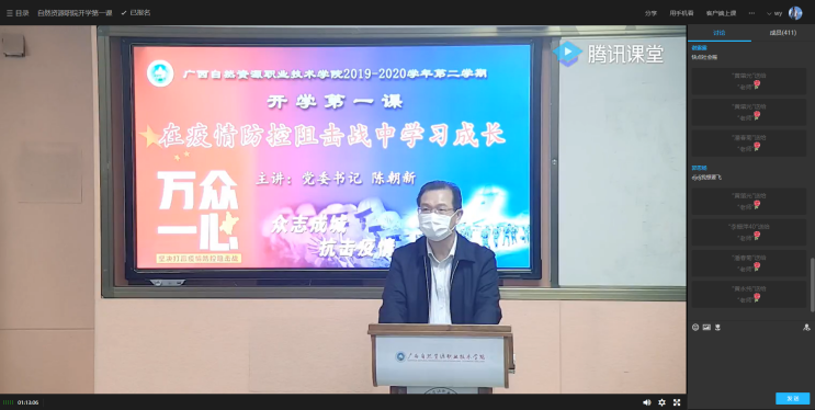 2020年3月2日上午11:30,由学院党委书记陈朝新担任主讲人,为全院师生开讲了网上开学第一课。