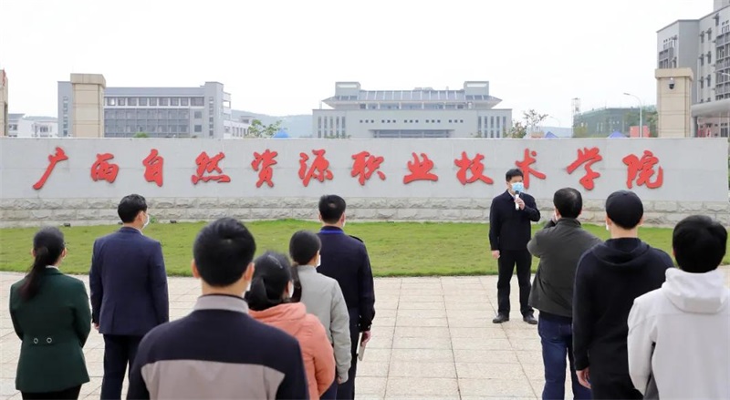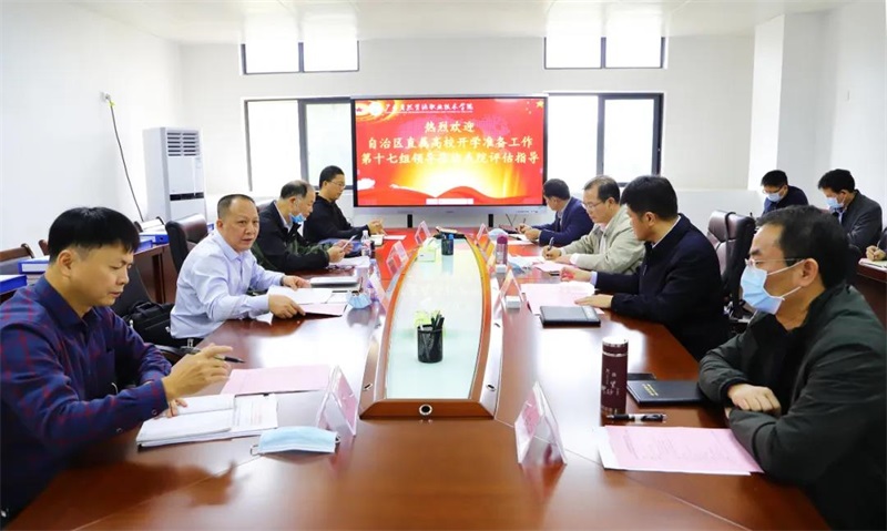 评估组由自治区自然资源厅二级巡视员黄位斌、二级调研员冯戈、自治区疾控中心专家张鸿满、自治区交通厅教科处干部韦尧昌等组成。学院领导陈朝新、冯兵、刘勇、韦绍宁向评估组阐述了学院的相关准备情况。