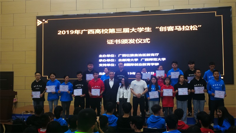 11月15日至16日,2019年全区高校第三届大学生“创客马拉松”活动在北部湾大学举行,来自全区54所高校,共120多名师生参加了此次活动。商贸管理系李斌老师和自然资源工程系周悦同学代表pp电子官方网站参加活动。
