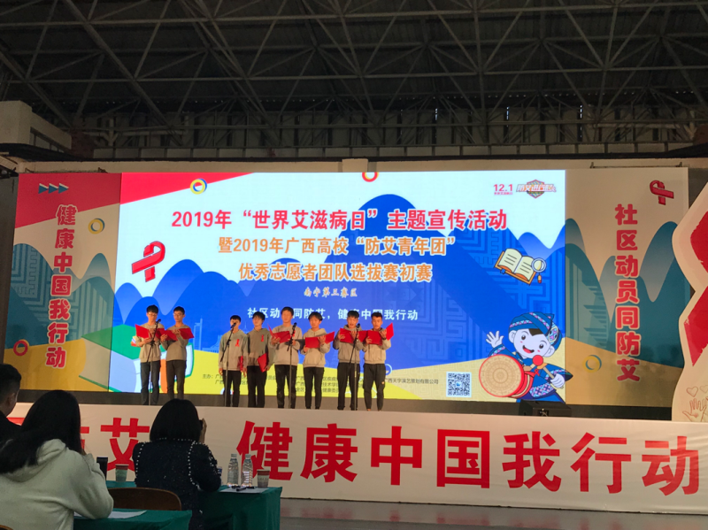 2019年“世界艾滋病日”主题宣传活动暨2019年广西高校“防艾青年团”优秀志愿者团队选拔赛初赛于12月2日在南宁开赛,商贸管理系会计2班八名同学代表pp电子参加了南宁第三赛区比赛。