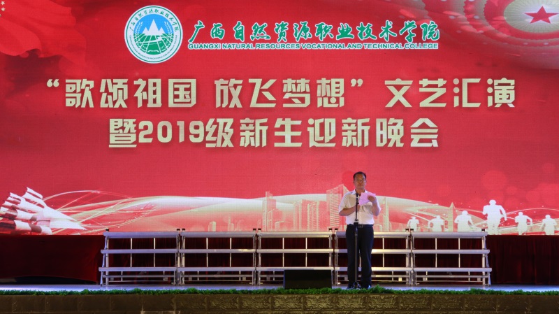 临时党支部书记、主持全面工作负责人陈朝新作热情洋溢的致辞。随着广西机电工业学校节目《盛世欢歌》乐曲奏响,在曼妙的舞姿中,晚会拉开了序幕。
