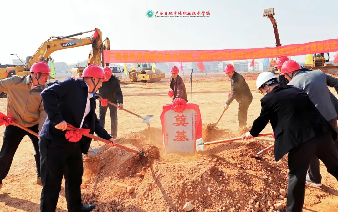 当天,自然资源厅二级巡视员黄位斌、广西华宇建工有限公司董事长何强、学院院长冯兵、学院党委副书记兼纪委书记刘勇、学院副院长宇鹏、自然资源厅人事处副处长谢思迪、厅机关党委副书记(机关纪委书记)牟进亮、厅机关服务中心副主任李活英、学院中层干部、中国—东盟南宁空港扶绥经济区管理委员会领导,及项目施工、监理、设计、检测、造价等参建部门代表,参与了奠基仪式。仪式由刘勇主持。