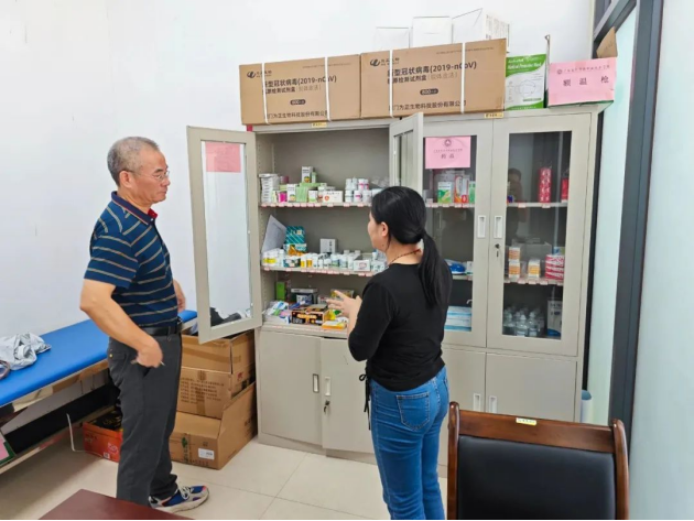 (学院副院长韦绍宁到医务室检查常用药物准备情况)