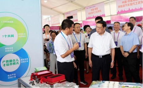 自治区人民政府副主席李常官(中)在职教周展台听取院长冯兵的介绍