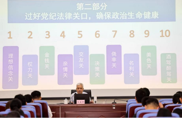 韦翼群从“认真学习贯彻党的二十大全面从严治党要求”“过好党纪法律关口,确保政治生命健康”“领导干部率先垂范是推进清廉学院建设队伍的有力保障”等三个方面对党纪法规进行全面阐述及解读,教育引导广大党员干部做到学纪、知纪、明纪、守纪,弄明白能干什么,不能干什么,真正让党员干部受警醒、明底线、知敬畏。