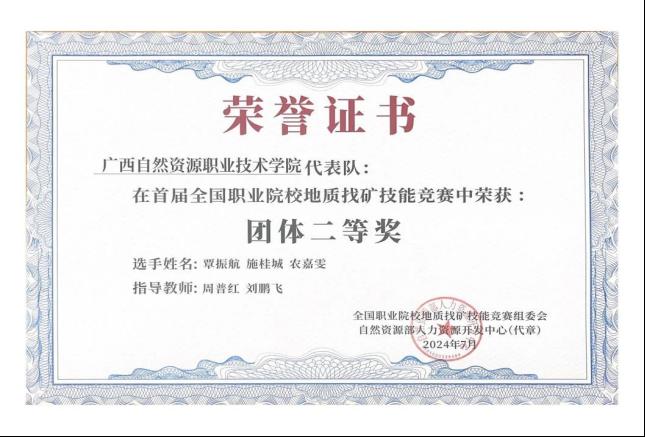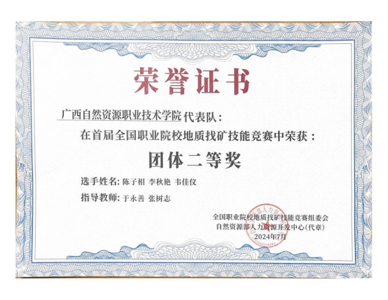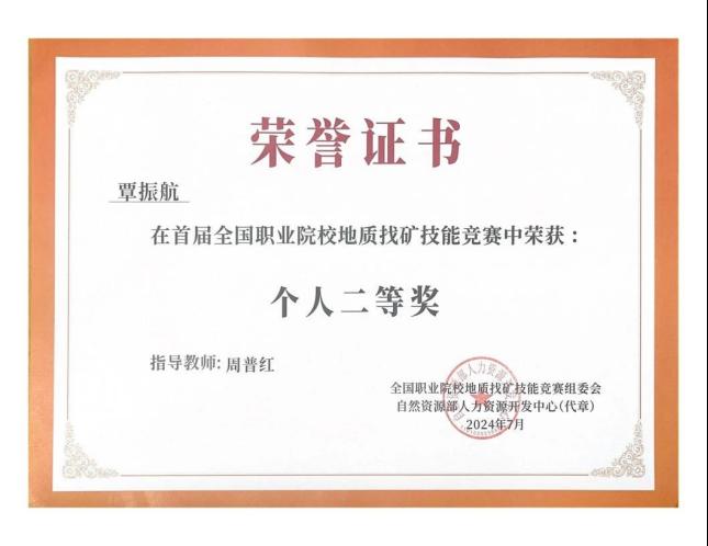 2024年9月,喜讯传来:在由自然资源部地质勘查管理司、科技发展司指导,自然资源部人力资源开发中心主办的“首届全国职业院校地质找矿技能竞赛”中,pp电子官方网站学子喜获团体二等奖2项,个人二等奖1项。