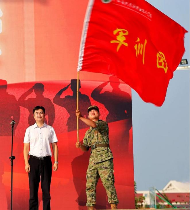 成国立为军训团授旗,2024级新生军训团团长、总教官曾胜接旗。