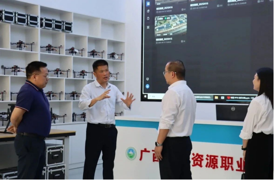 培训期间,中国移动通信崇左分公司总经理蒋鑫一行到机电工程系无人机应用技术实训基地调研。除了观摩学员实践操作,调研组还重点考察了机电工程系自主研发的无人机数据调度平台,对其智能化任务分配、多机协同管控及数据传输功能给予高度评价。