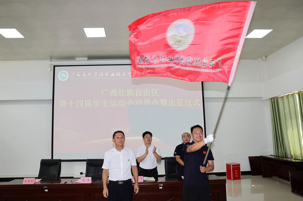 为全力备战2025年广西壮族自治区第十四届学生运动会,我校公共基础部于7月3日上午10时在学院行政楼501会议室举行出征大会。参加本次出征大会的领导有,学院党委副书记刘勇、公共基础部负责人汪元飞、体育组负责人王得有,以及体育组全体教师、各比赛项目教练员及全体参赛运动员。