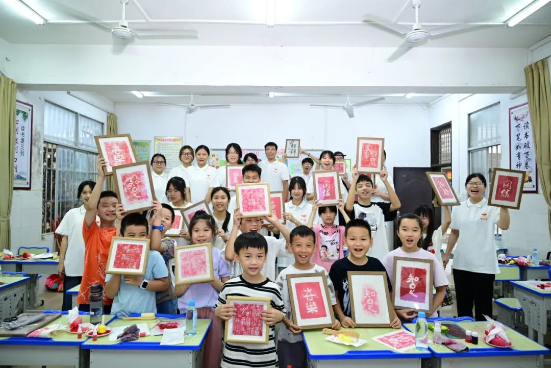 服务团用青年视角和话语,与边境线上多民族聚居地的少先队员开展互动式教学。通过“中华民族一家亲”稻谷画制作、百米画卷等美育课堂、非遗课堂,让孩子们领略中华文化的博大精深。