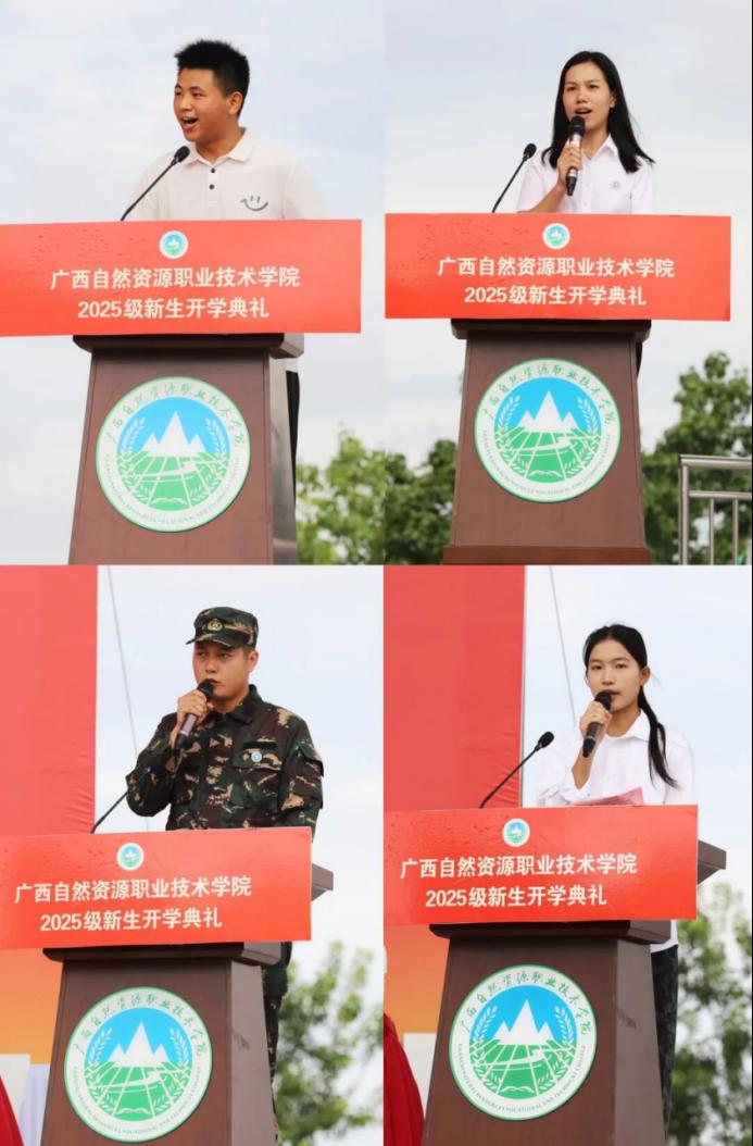 在代表发言环节,四名师生代表从不同角度分享心得、表达祝愿:2024级学生代表、机电工程系高宏达同学,结合自身经历,鼓励学弟学妹珍惜时光、主动探索,积极融入丰富多彩的大学生活;商贸管理系的苏妍老师作为教师群体的代表,承诺将以身作则、恪尽职守,做学生成长的引路人和知心朋友,并寄语新生“瞄准职业坐标、勇于破圈成长、守住自律底线”;优秀退役军人新生代表、商贸管理系软件技术3班梁蓥安同学誓言把军人作风带入校园,刻苦钻研、争做表率,为校园注入一股“硬核”的青春力量;2025级新生代表、自然资源工程系工程测量技术3班黄舒琪同学,呼吁全体新同学以“广学”立基、以“求益”为要、以“自省修身”为尺,在广自这片热土上,度过充实的大学生涯,成就更好的自己。