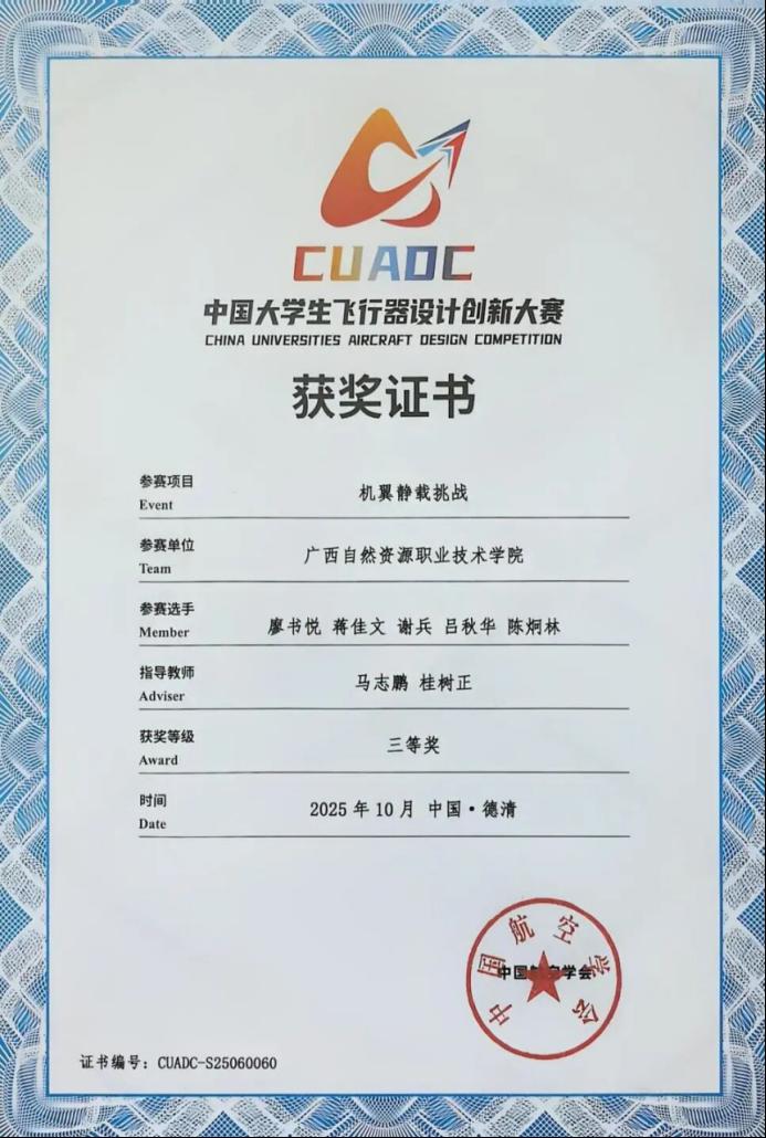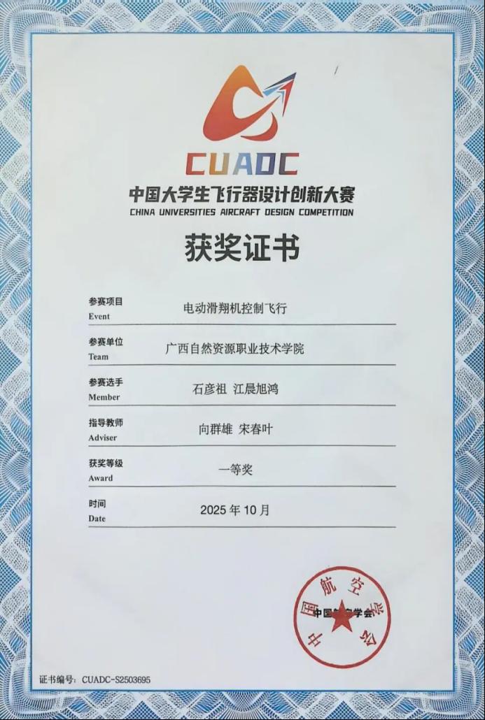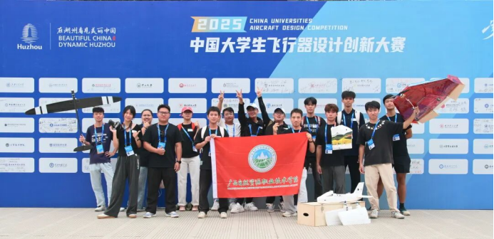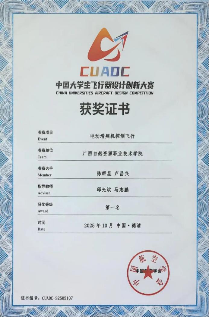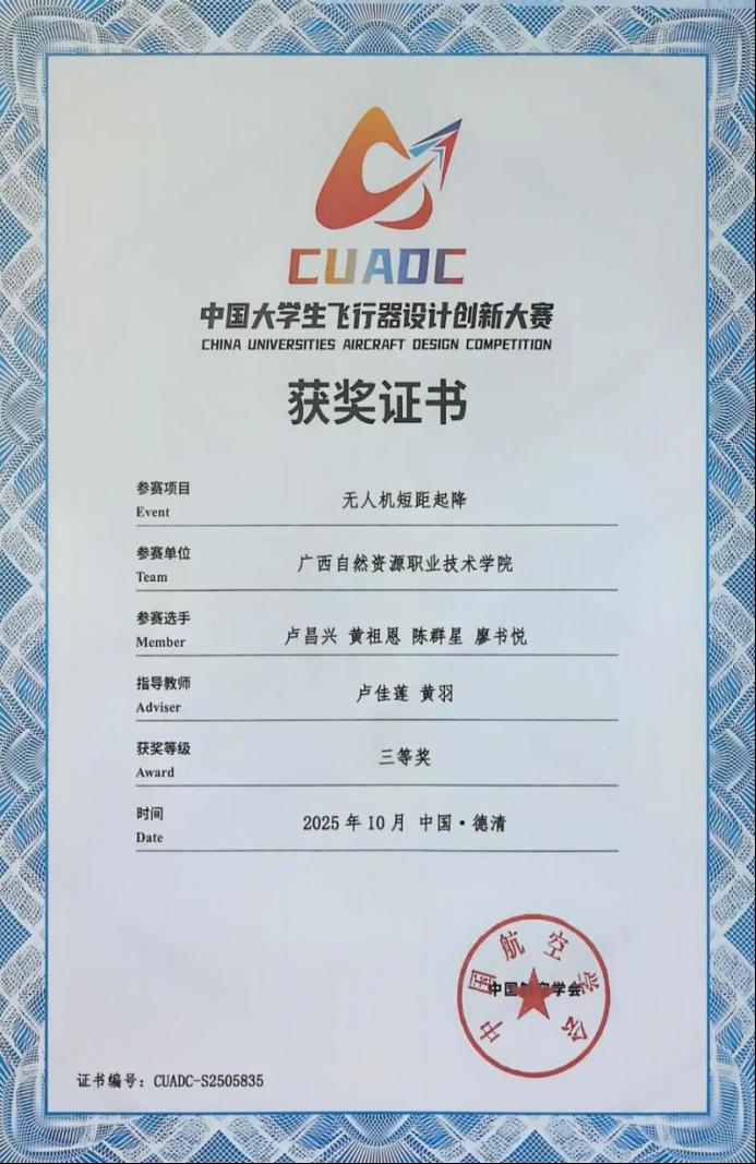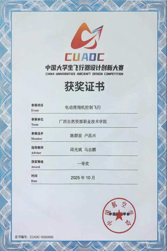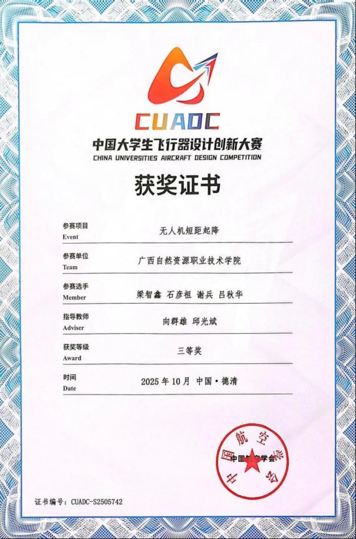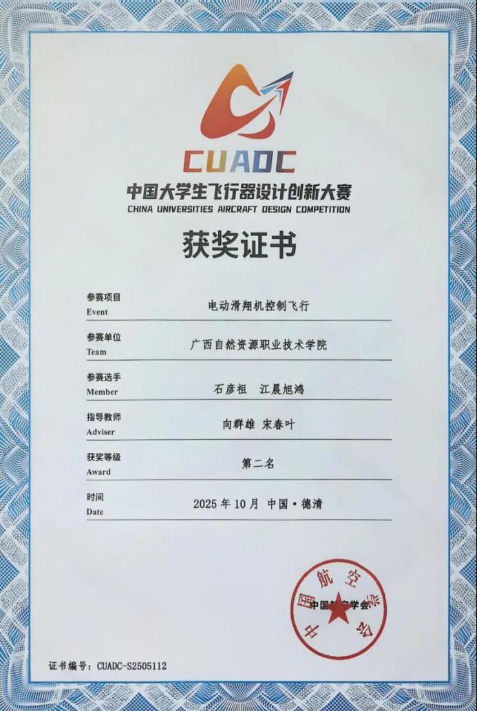 “从反复优化短距起降参数,到在操场验证‘短距离起飞’的每一次突破,终于凝成这份荣誉!感谢评委看见我们的巧思,也谢谢队友陪我‘折腾’到底。接下来,要让更多航空创意在广自校园里起飞!”