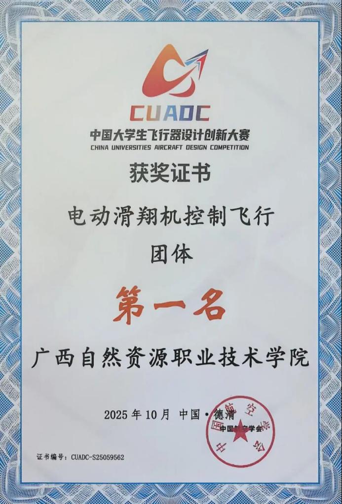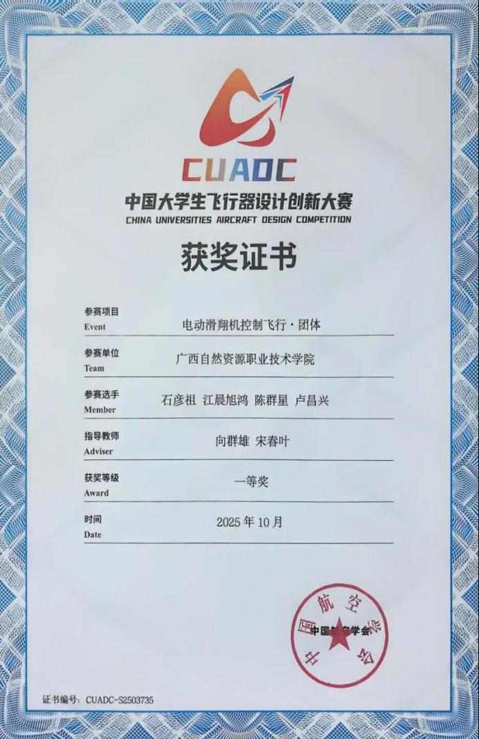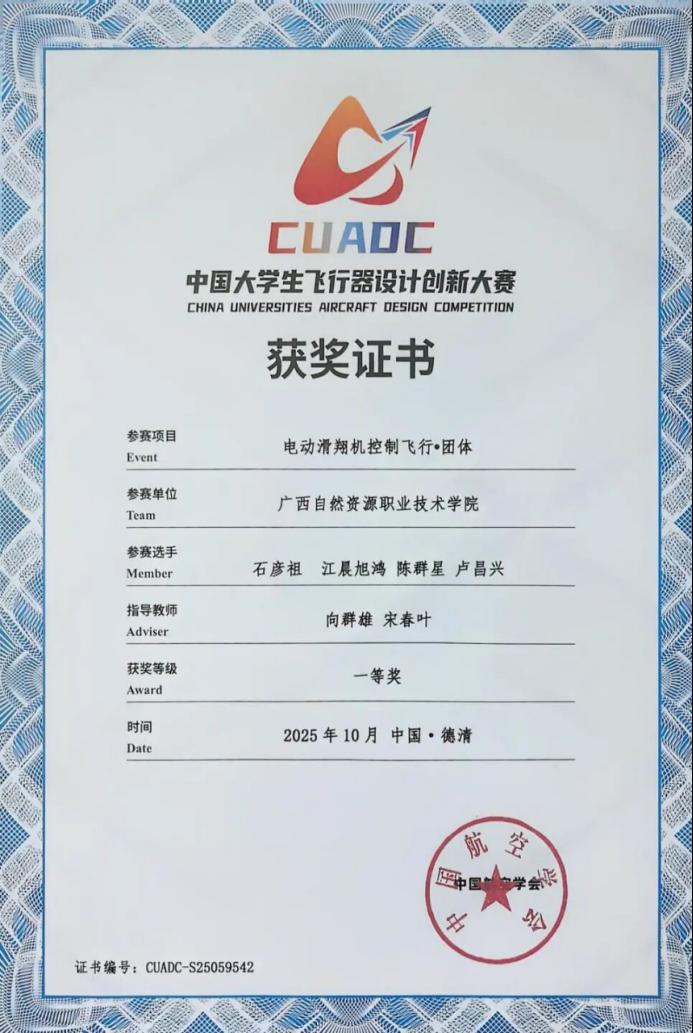 其中:陈群星、卢昌兴、石彦祖、江晨旭鸿荣获电动滑翔机电动飞行赛项全国团体第一名;陈群星、卢昌兴荣获电动滑翔机电动飞行赛项全国一等奖;石彦祖、江晨旭鸿荣获电动滑翔机电动飞行赛项全国一等奖;梁智鑫、石彦祖、谢兵、吕秋华荣获无人机短距起降赛项全国三等奖;卢昌兴、陈群星、黄祖恩、廖书悦荣获无人机短距起降赛项全国三等奖;廖书悦、蒋佳文、陈炯林、谢兵、吕秋华荣获机翼静载挑战赛项全国三等奖;江晨旭鸿、梁智鑫、袁亚莉、蒋佳文 荣获固定翼无人机侦察与打击赛项全国三等奖。