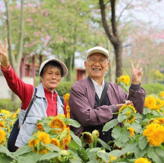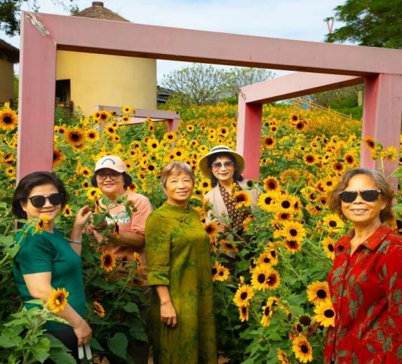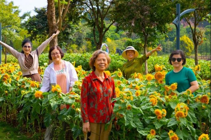 活动全程的欢声笑语此起彼伏。金黄的向日葵竞相绽放,老同志们漫步于园中小径,彼此间亲切交流。