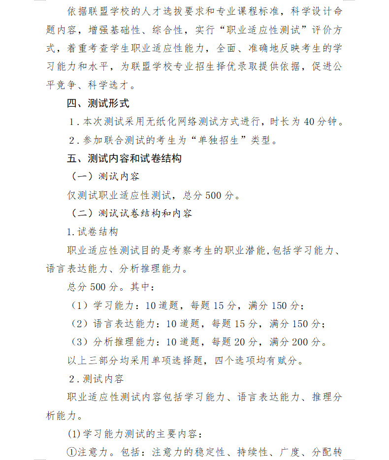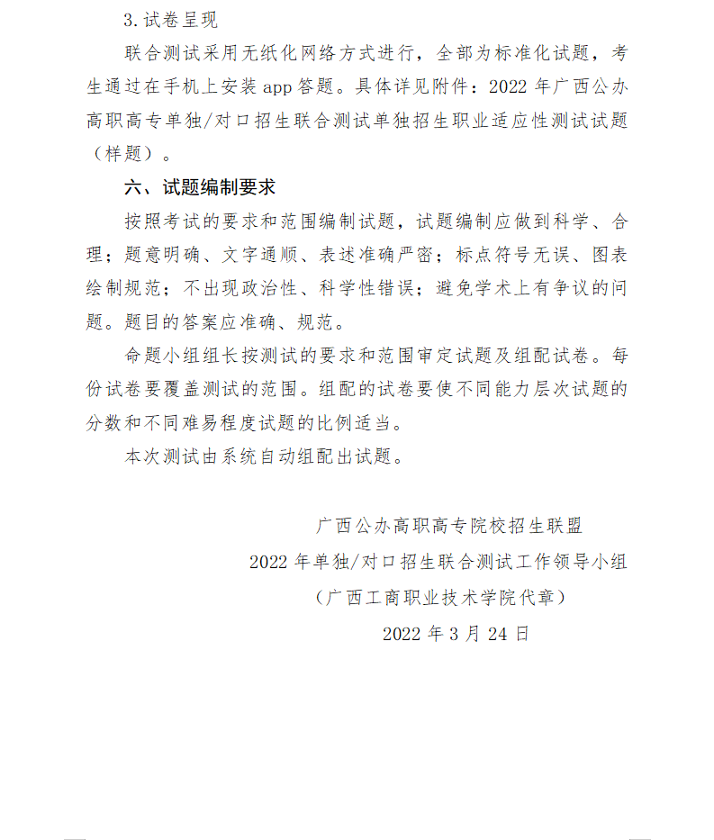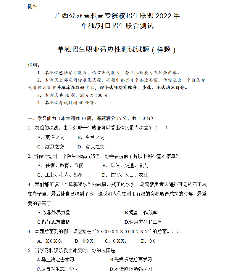 广西公办高职高专院校招生联盟2022年单独/对口招生联合测试《职业适应性测试》 单独招生考试大纲及样题