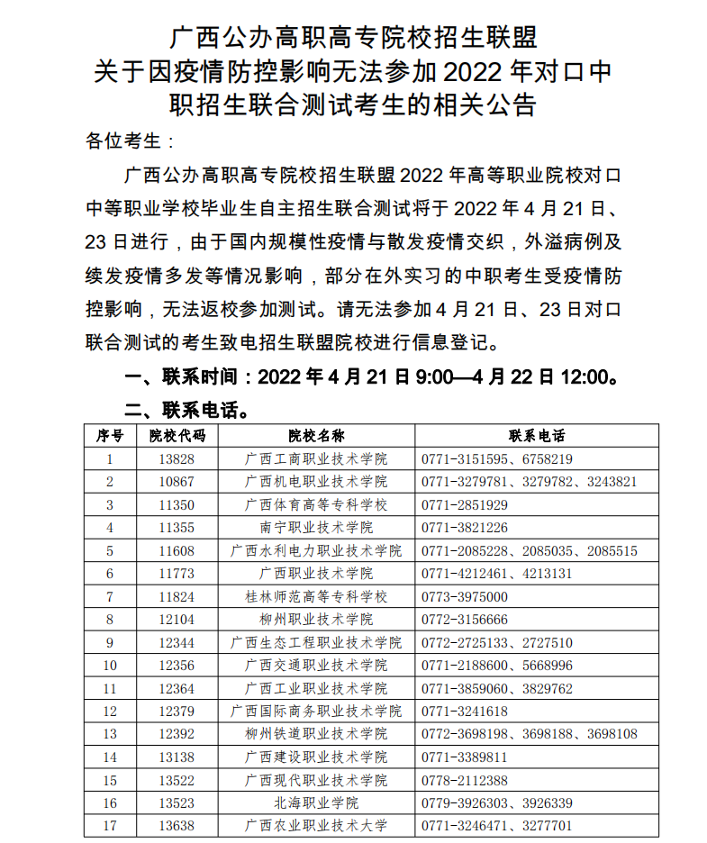 关于因疫情防控影响无法参加2022年对口中职招生联合测试考生的相关公告