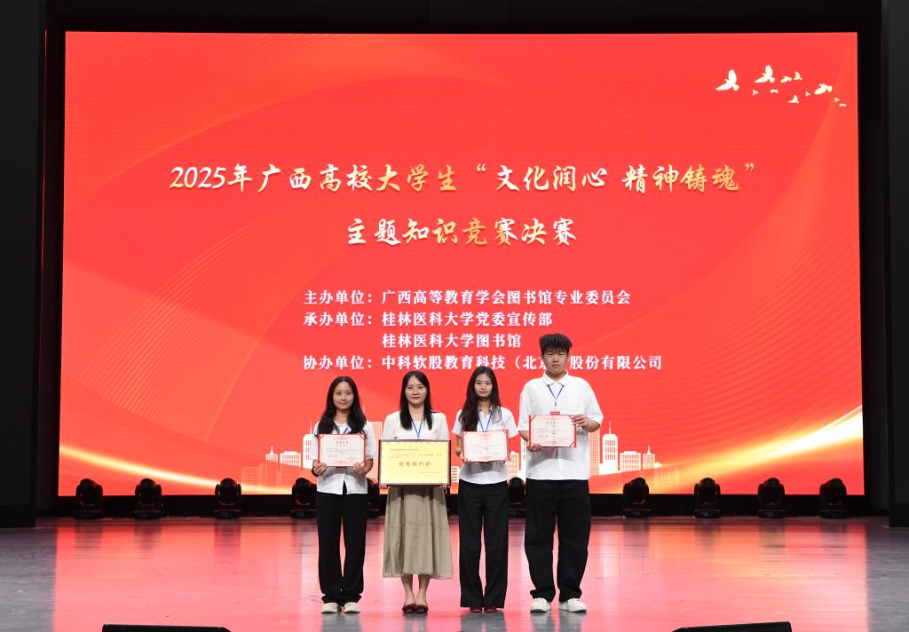 5月24日,2025年广西高校大学生“文化润心 精神铸魂”主题知识竞赛决赛在桂林医科大学顺利举行。我校商贸管理系2022级电子商务6班杨诗诗、机电工程系2023级机电一体化1班李佳政、自然工程系2024级工程测量技术2班梁琼芳三名同学凭借扎实的知识储备与出色的现场表现,荣获高职高专院校组三等奖;我校图书馆荣获优秀组织奖。