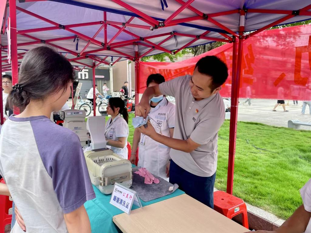 视力健康角成为关注焦点,专业人员使用标准视力表和验光仪为师生进行免费视力检测,科普护眼知识,提供眼镜清洁与微调服务,引导师生更加关注视力健康。