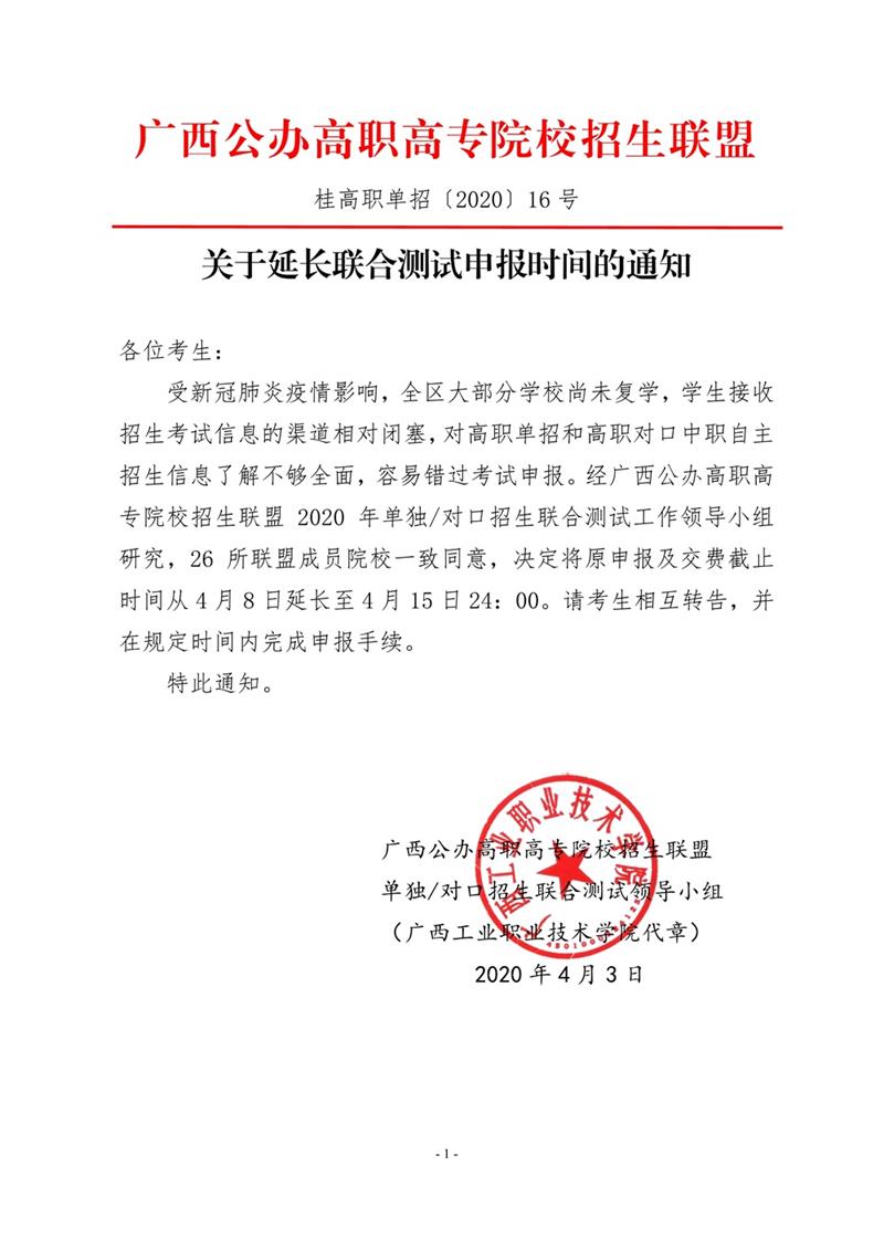 受新冠肺炎疫情影响,全区大部分学校尚未复学,学生接收招生考试信息的渠道相对闭塞,对高职单招和高职对口中职自主招生信息了解不够全面,容易错过考试申报。经广西公办高职高专院校招生联盟 2020 年单独/对口招生联合测试工作领导小组研究,26 所联盟成员院校一致同意,决定将原申报及交费截止时间从 4 月 8 日延长至 4 月 15 日 24:00。请考生相互转告,并在规定时间内完成申报手续。