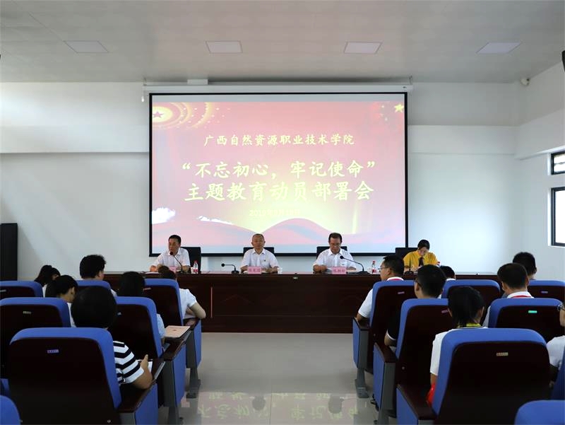 陈朝新在动员报告中就学院开展“不忘初心、牢记使命”主题教育作了全面部署,指出要提高思想认识,深刻领会开展主题教育的目的和意义,坚持领导带头,加强组织领导,确保主题教育扎实推进。全体党员干部自觉地投入到自然资源及职业教育服务广西经济社会高质量发展的时代大潮中去,形成团结奋进、攻坚克难的强大动力,奋力开创新时代学院工作新局面。