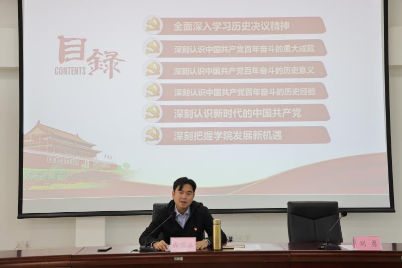会上,学院党委书记成国立作专题党课,他要求全院师生要从党的百年奋斗重大成就和历史经验中汲取智慧力量,以更加昂扬的姿态走好新的赶考之路,致力培养高素质应用型人才,立足广西,面向东盟,服务“一带一路”。