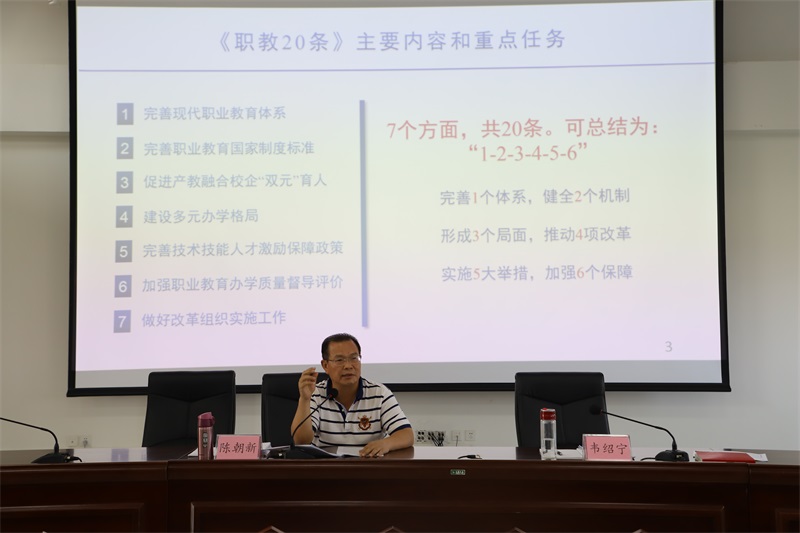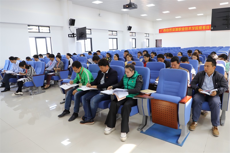 活动分为两个议程,第一个议程为全体教职工政治理论学习。会上,党委书记陈朝新传达了《自治区教育厅关于追授冯海伦同志“自治区优秀教育工作者”荣誉称号的决定》,号召全院教职工以冯海伦同志为榜样,学习他心怀大我、无私奉献的至诚情怀,学习他爱岗敬业、为人师表的高尚师德,学习他勤勉务实、真抓实干的工作作风,以高度的责任感使命感和更加昂扬的精神状态,争做党和人民满意的“四有”好老师,为加快推进我区教育现代化不懈努力。陈朝新书记还领学了《广西壮族自治区人民政府关于印发广西职业教育改革实施方案的通知国家职业教育改革实施方案》,他指出,在贯彻落实国家目标和要求的基础上,狠抓落细落实,扎根八桂大地,奋力办好自然资源特色职业技术学院。